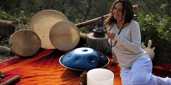 Elena uses gongs, hang drum, quartz singing bowls, shamanic drums, flutes and voices.